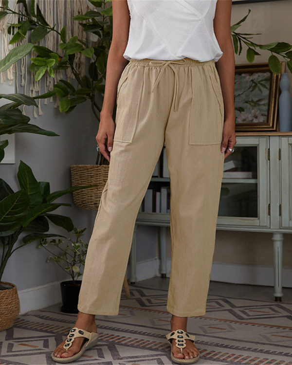Casual Solid Pocket Elastic Waist Linen Pants