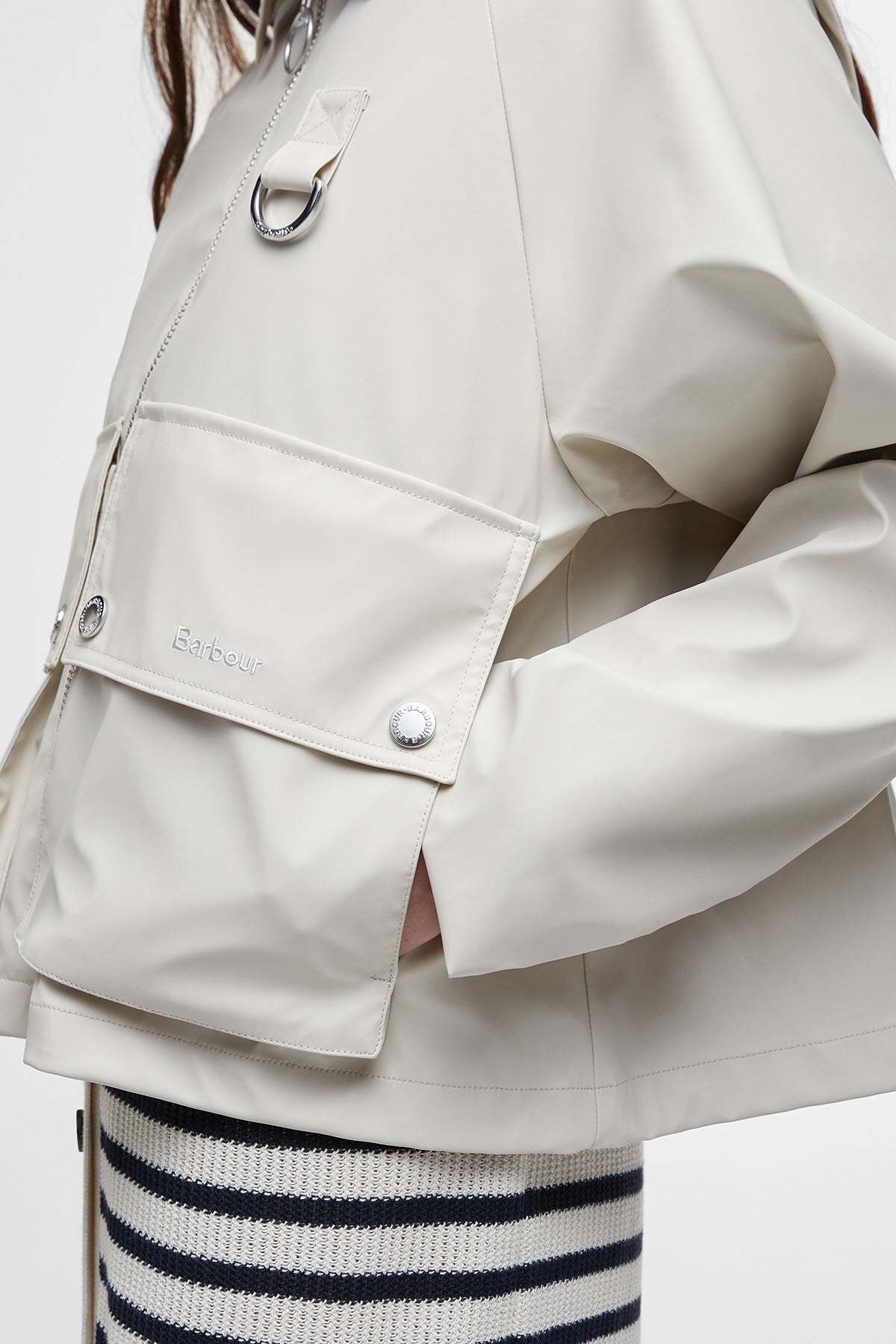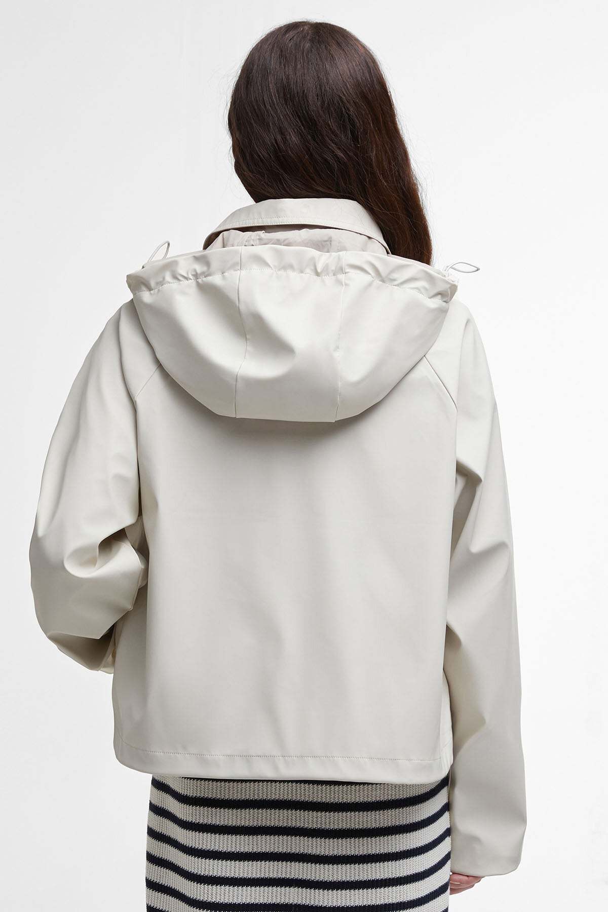 La giacca antipioggia June firmata Barbour presenta lo stesso taglio corto del modello a cui si ispira, l'iconica giacca cerata Spey. Originariamente concepita per essere indossata con i waders durante le battute di pesca, la giacca Spey ha continuato a ispirare tanti nuovi modelli di Barbour anche dopo che la sua produzione fu interrotta nel 1997. Realizzata in tessuto gommato per offrire una maggiore protezione, questa versione presenta un cappuccio rimovibile, pratiche tasche e dettagli con anello a D che aggiungono un tocco contemporaneo al classico modello di Barbour.