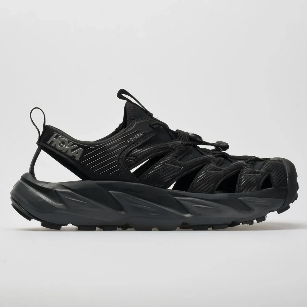 Navigate technical terrain with ease in the HOKA Hopara. These mountain sandals were made for the outdoor explorer. with a protective upper. responsive midsole. and a sticky outsole for slick surfaces. Enjoy a locked-in fit with strategic cutouts for drainage to keep you dry in wet conditions. Versatile 4mm multidirectional lugs dig deep into the dirt to generate grip on uneven surfaces. The rubberized toe cap offers protection against trail debris. so you can make the most out of your off-road adventures.